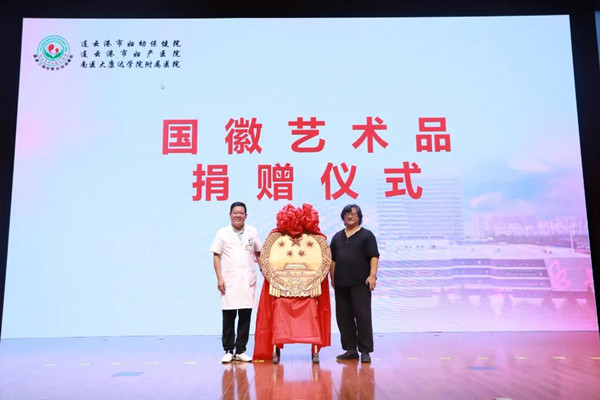 在国庆节来临之际,为深化爱国主义教育和国徽精神内涵领悟,9月30日上午,连云港市妇幼保健院举行国徽艺术品捐赠仪式。江苏省雕塑家协会副主席、连云港市工艺美术学会会长周存玉大师,市工艺美术学会副会长王金中,院领导班子成员及部分中层干部五十余人共同参加了仪式。捐赠仪式由副院长汤丽莎主持。